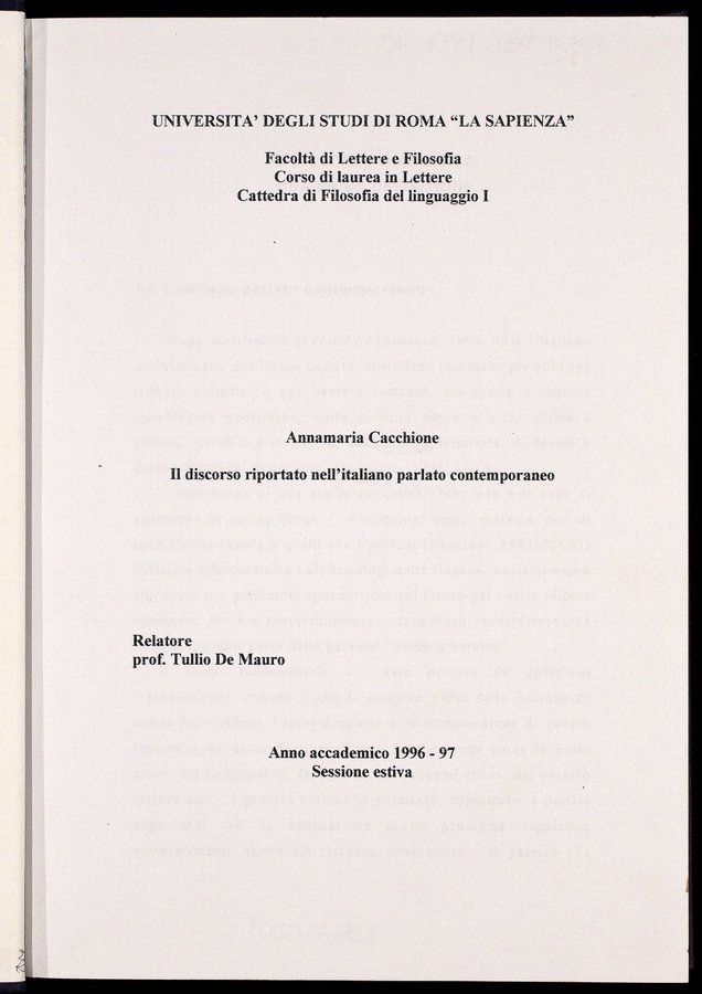 Il discorso riportato nell'italiano parlato contemporaneo / Annamaria Cacchione ; relatore: Tullio De ...