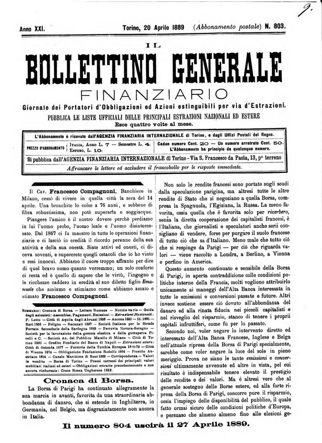 Il bollettino generale finanziario giornale dei portatori d'obbligazioni ed azioni estinguibili per via d'estrazioni