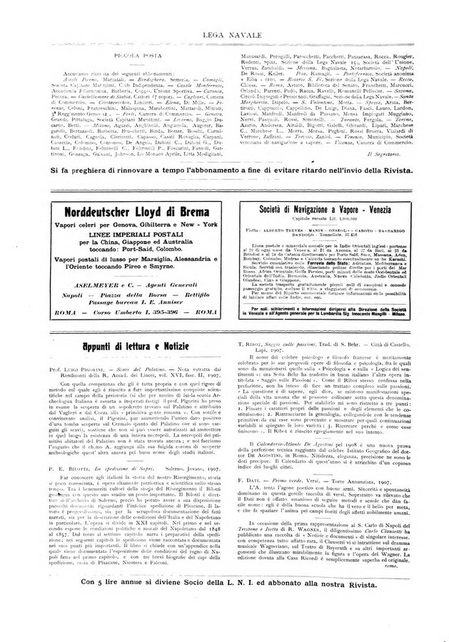 - Da settembre 1909 diventa quindicinale - Solo per a.8 (1912) n. 11-12 Legati la rivista si chiama Mare Nostrum - Dal 1918 ritorna mensile