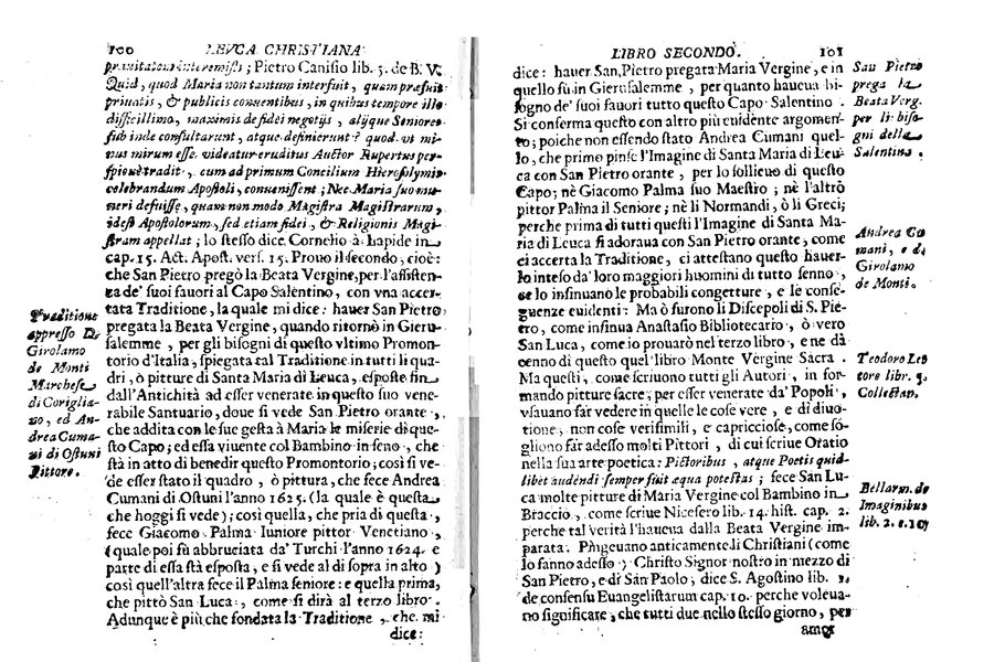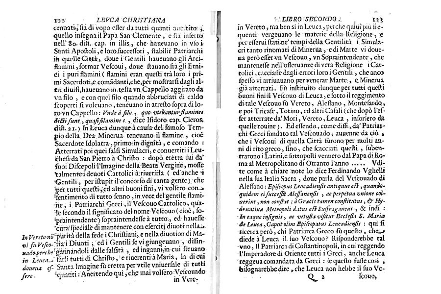 - Riferimenti: G. Scrimieri, Annali di Pietro Micheli, p. 238-240 - Titolo dell'occhietto: Antichità di Leuca - Vignetta xilografica (Immacolata Concezione) a carta 2P1v; stemma xilografico (aquila bicipite coronata e cinta del collare del Toson d'oro) a carta 4E2v - Segnatura: [a]-h⁴ A-4L⁴; corsivo, romano; iniziali e fregi xilografici.