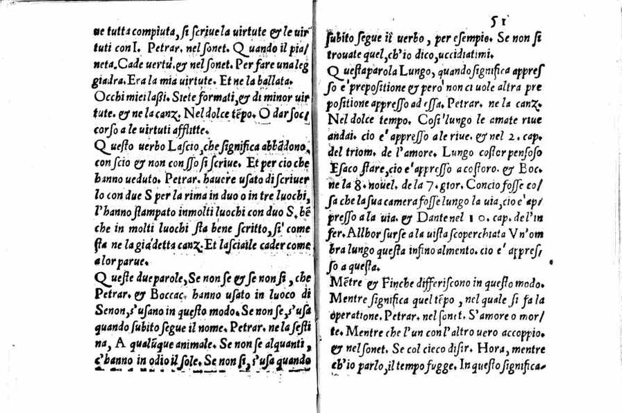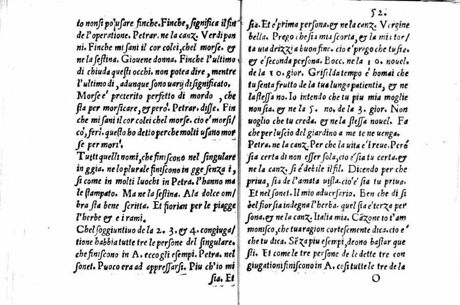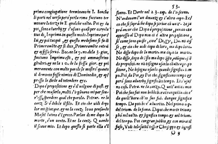 - Per l'autore cfr.: G. Ghinassi, Correzioni editoriali di un grammatico del Cinquecento, in: Studi di filologia italiana, XIX, 1961, p.39 - Segnatura: A-Q⁴; ripetute nella numerazione le carte 16 e 59; la carta 23 segnata 13; corsivo, romano; iniziale e cornice del frontespizio xilografiche.