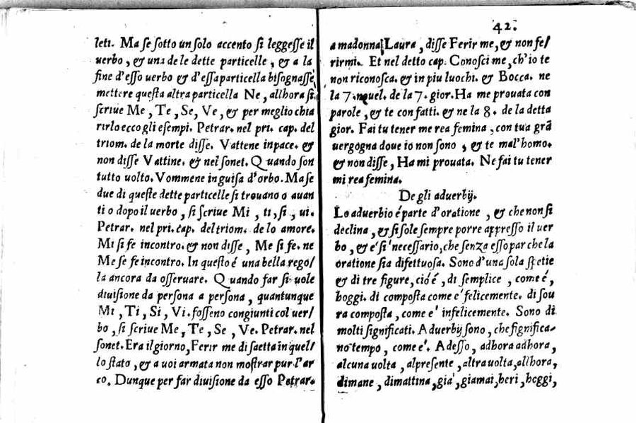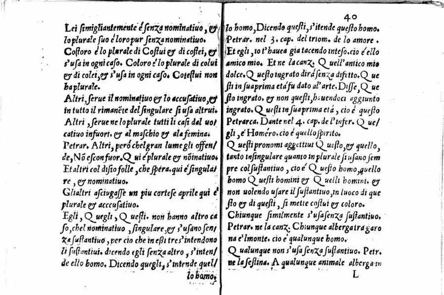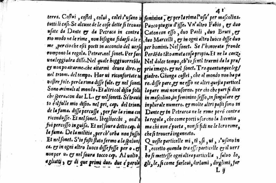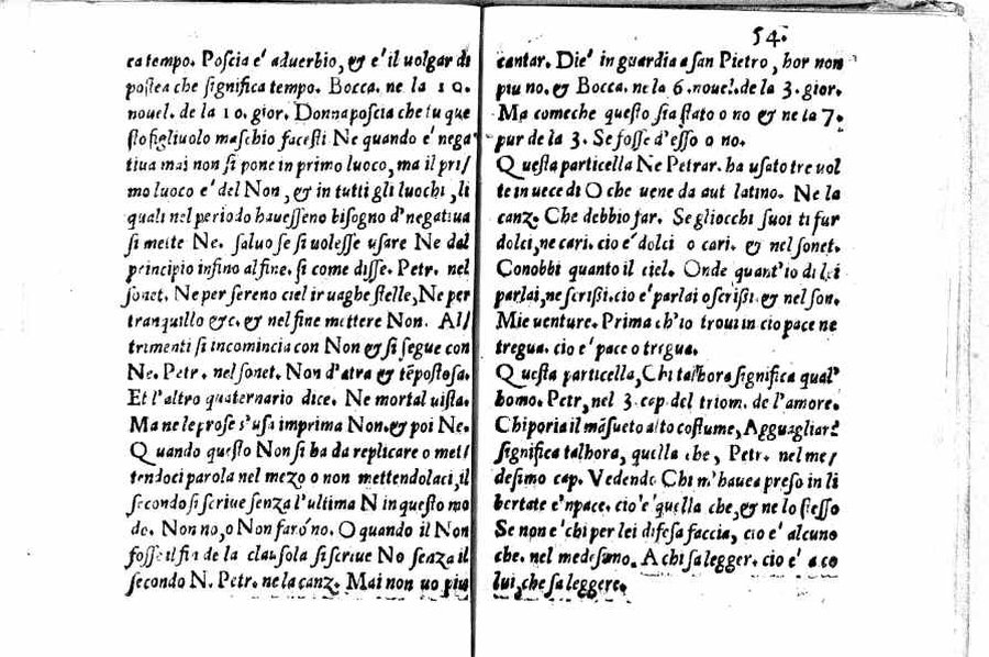 - Per l'autore cfr.: G. Ghinassi, Correzioni editoriali di un grammatico del Cinquecento, in: Studi di filologia italiana, XIX, 1961, p.39 - Segnatura: A-Q⁴; ripetute nella numerazione le carte 16 e 59; la carta 23 segnata 13; corsivo, romano; iniziale e cornice del frontespizio xilografiche.