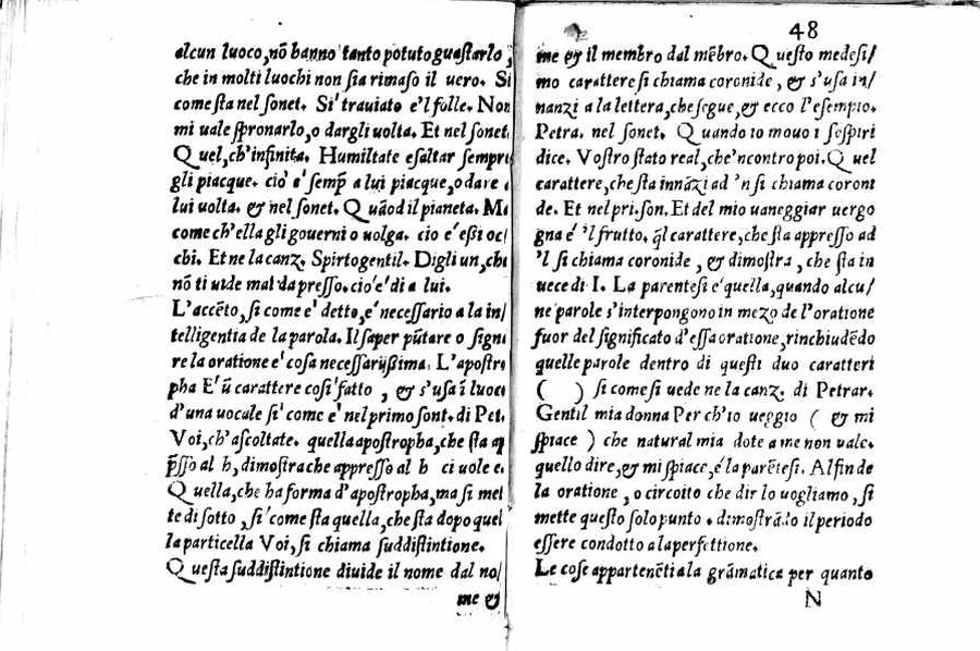 - Per l'autore cfr.: G. Ghinassi, Correzioni editoriali di un grammatico del Cinquecento, in: Studi di filologia italiana, XIX, 1961, p.39 - Segnatura: A-Q⁴; ripetute nella numerazione le carte 16 e 59; la carta 23 segnata 13; corsivo, romano; iniziale e cornice del frontespizio xilografiche.
