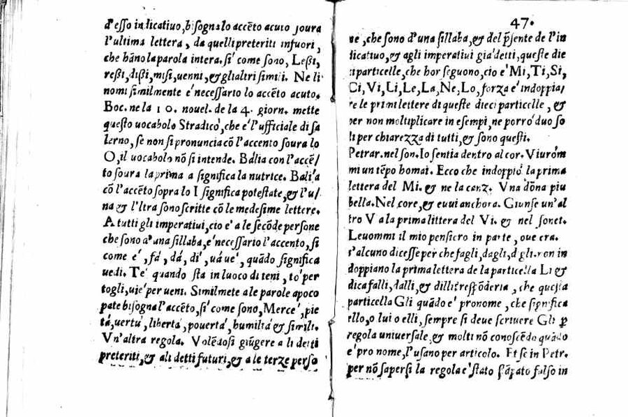 Per l'autore cfr.: G. Ghinassi, Correzioni editoriali di un grammatico del Cinquecento, in: Studi di filologia italiana, XIX, 1961, p.39 - Segnatura: A-Q⁴; ripetute nella numerazione le carte 16 e 59; la carta 23 segnata 13; corsivo, romano; iniziale e cornice del frontespizio xilografiche.
