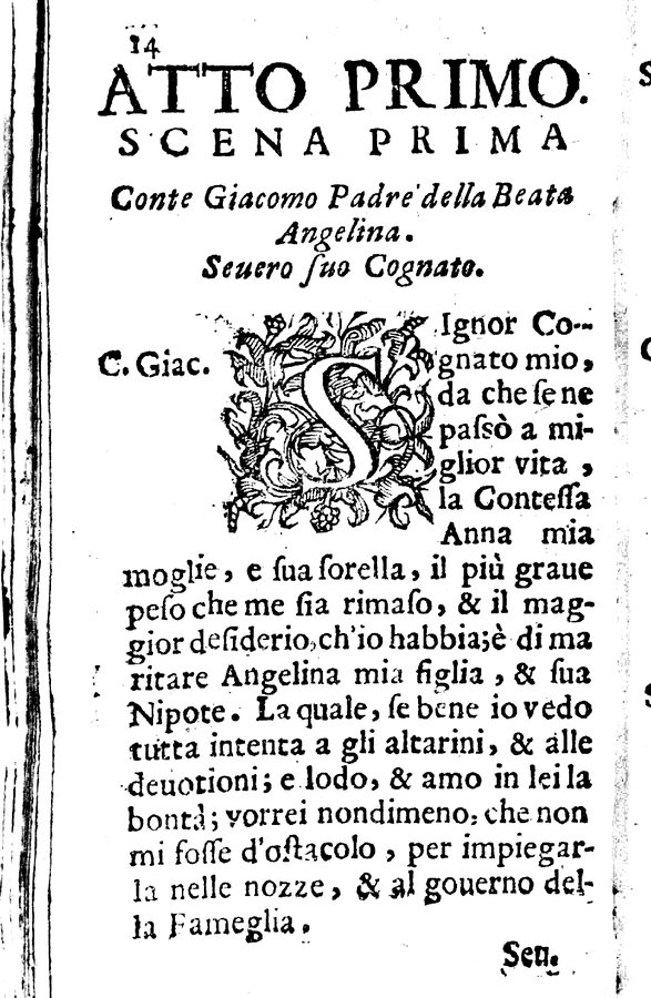 Dettaglio libro antico : La beata Angelina tragicomica rappresentatione. Del signor Francesco Cirocco da Foligno. Esposta alle stampe dal sig. ...