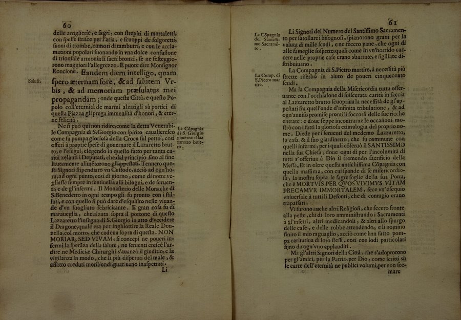 - Segn.: [A]-K⁴ - Bianca la c. K4 - Antip. calcogr. disegnata da Matteo Piccioni e incisa da Louis Rouhier, che reca il tit: Raguaglio della peste in Riete e de modi tenuti per estirparla - Stemma calcogr. del dedicatario sul front.