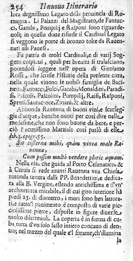Titolo dell'antiporta: Itinerario d'Italia - Parte della sottoscrizione ("al Banco di S. Spirito") è stampata su una striscia di carta incollata a coprire una precedente "Librari à Pasquino" - Marca (Salamandra tra le fiamme) sul frontespizio - Segnatura: a⁴ χ1 2χ² (2χ2 bianca) A-2C¹² 2D²; carta a2 segnata a3.