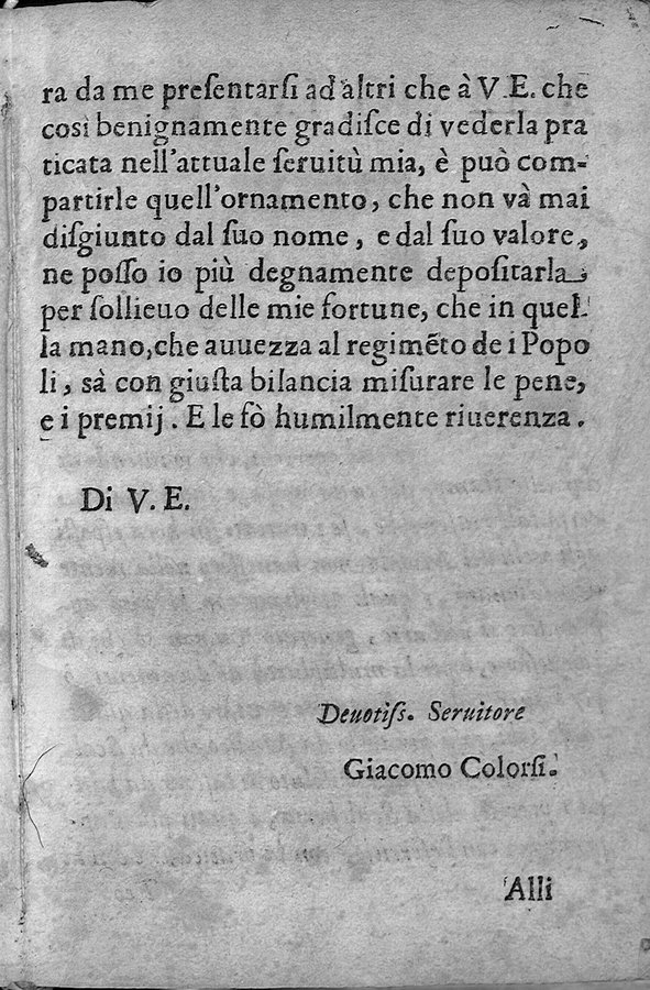 - Segn.: a⁴A-O⁴ - Stemma calcogr. del dedicatario sul front.