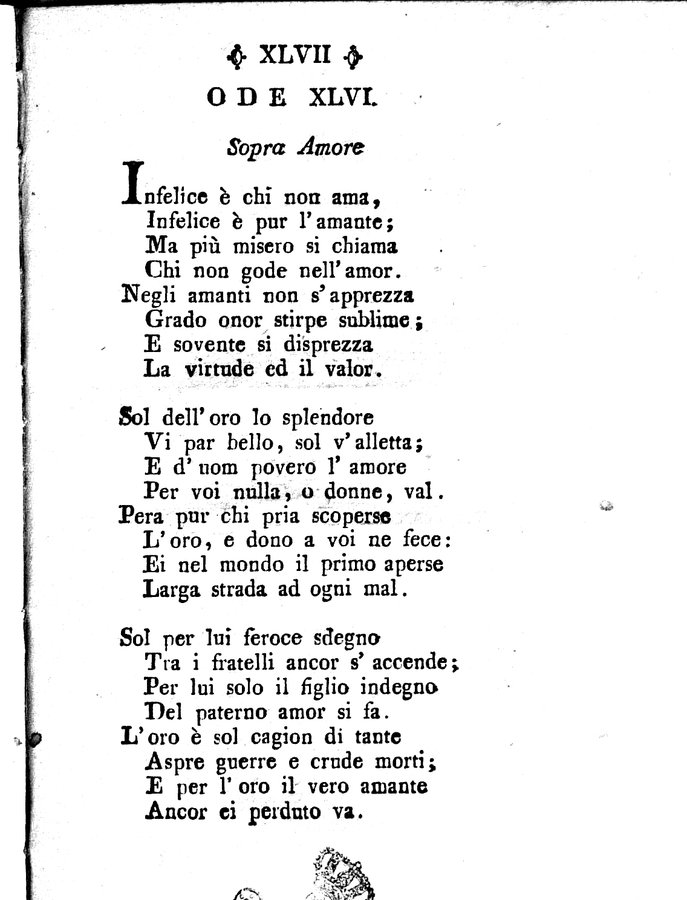 - Segn.: [1]-[3]⁸ - A c. [3]2r inixia con prorpio occhietto: Odi scelte di Anacreonte - Piccolo fregio xilogr. sul front.
