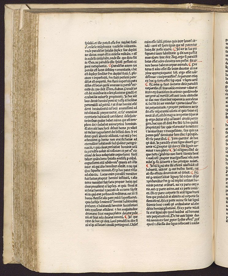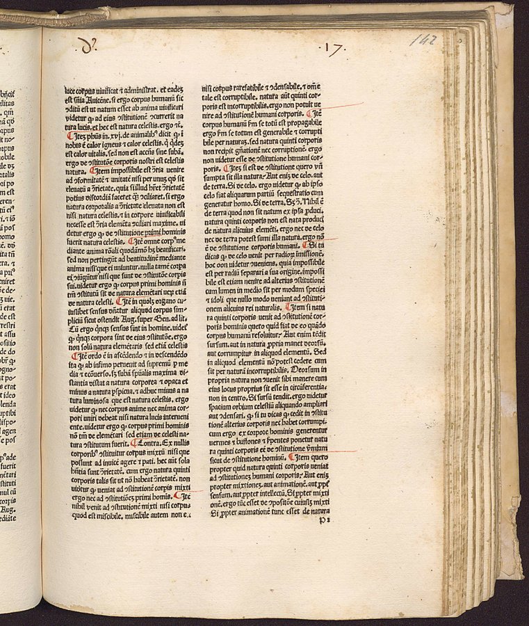 Riferimenti: GW 4658; HC 3539; IGI 1884; BMC VI, 892; Ageno, Librorum saec. 15..., a c.di Gasparrini Leporace, Firenze, Olschki...1954, n.150; copia digital. della Universitäts-und Landesbibliothek Düsseldorf disponibile in linea - Explicit legato al colophon a carta r5v - Spazi riservati per iniziali - Gotico - Testo su due colonne - Segnatura: A-O¹⁰ P-Q⁸ R¹⁰, a-f¹⁰ g¹² h-p¹⁰ q-r⁸.