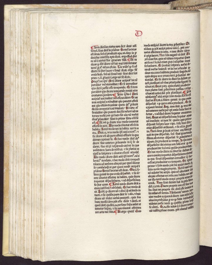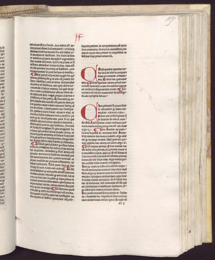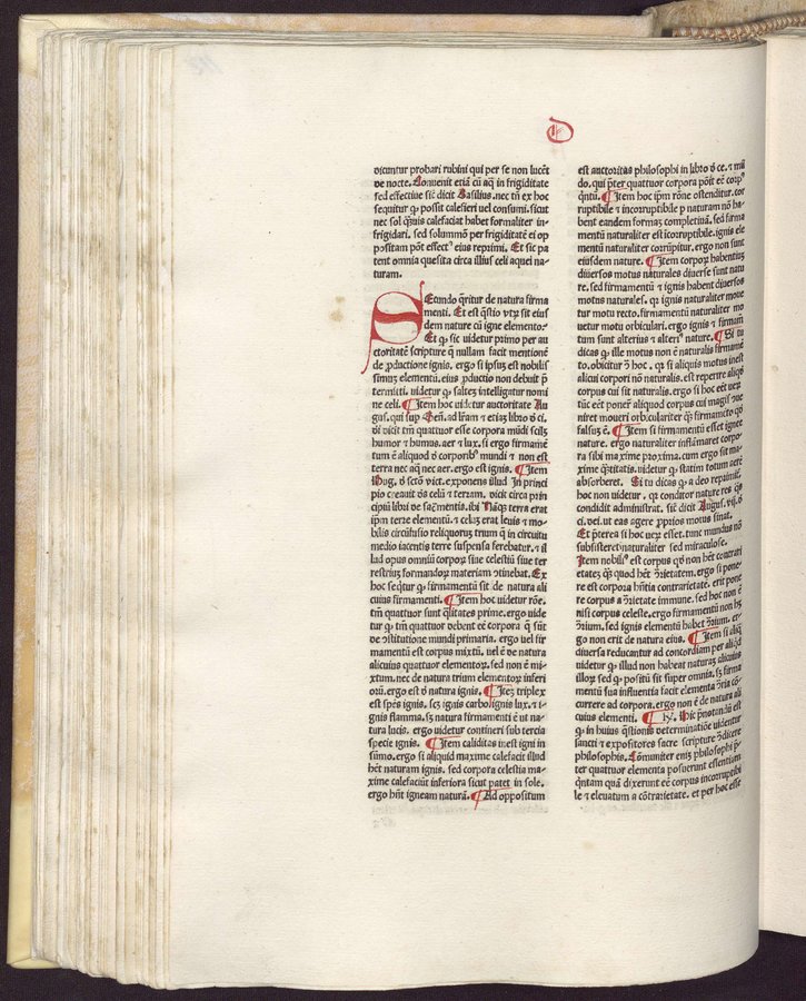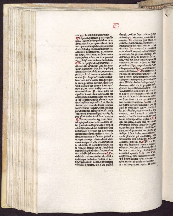- Riferimenti: GW 4658; HC 3539; IGI 1884; BMC VI, 892; Ageno, Librorum saec. 15..., a c.di Gasparrini Leporace, Firenze, Olschki...1954, n.150; copia digital. della UniversitaÌts-und Landesbibliothek DuÌsseldorf disponibile in linea - Explicit legato al colophon a carta r5v - Spazi riservati per iniziali - Gotico - Testo su due colonne - Segnatura: A-O¹ⰠP-Q⸠R¹â°, a-f¹Ⱐg¹² h-p¹Ⱐq-râ¸.