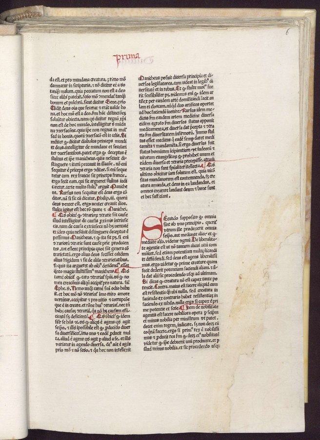 - Riferimenti: GW 4658; HC 3539; IGI 1884; BMC VI, 892; Ageno, Librorum saec. 15..., a c.di Gasparrini Leporace, Firenze, Olschki...1954, n.150; copia digital. della UniversitaÌts-und Landesbibliothek DuÌsseldorf disponibile in linea - Explicit legato al colophon a carta r5v - Spazi riservati per iniziali - Gotico - Testo su due colonne - Segnatura: A-O¹ⰠP-Q⸠R¹â°, a-f¹Ⱐg¹² h-p¹Ⱐq-râ¸.
