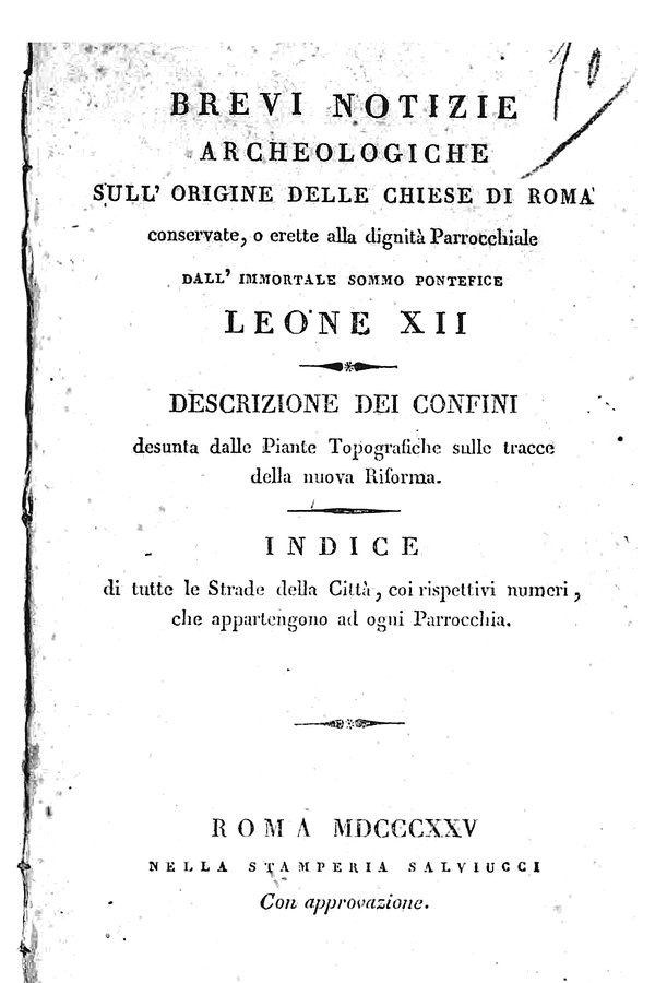 - Brevi notizie archeologiche sull'origine delle chiese di Roma conservate, o erette alla dignità parrocchiale dall'immortale sommo pontefice Leone 12. Descrizione dei confini desunta dalle piante topografiche sulle tracce della nuoua riforma. Indice di tutte le strade della città, coi rispettivi numeri, che appartengono ad ogni parrocchia / [Giovanni Battista Bontus]