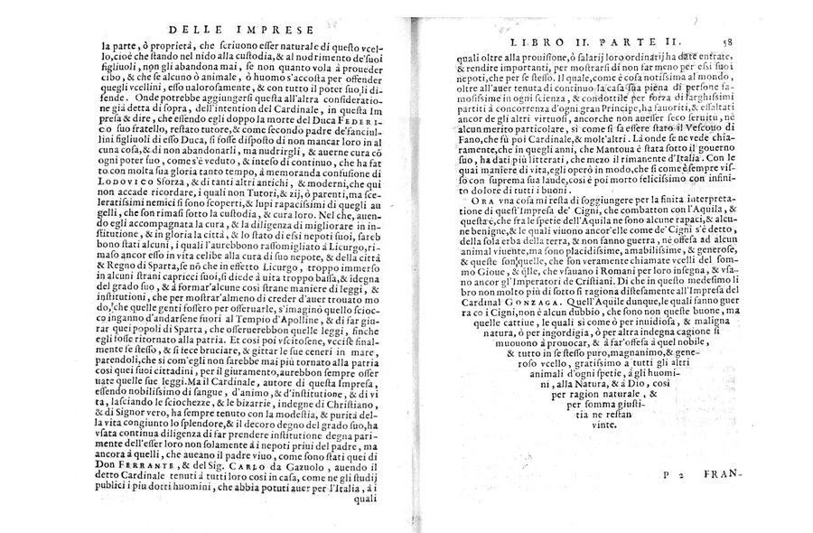 Riferimenti: EDIT 16 CNCE 24805 - Front. calcogr. con lo stemma del dedicatario Filippo II - Alle c. D2 e 3B4 front. calcogr. d'introduzione al secondo e al terzo libro - Ritr. dell'A. a c. ✝4v - Ill. calcografiche ; l'ill. doppia di c. 2L2v.-2L3r. è di Domenico Zenoi - Iniziali e fregi xil - Cors. ; gr. ; rom - Segn.: ✝⁴ A-3B⁴ 3C-3D⁴ 3E², 3C-4C⁴