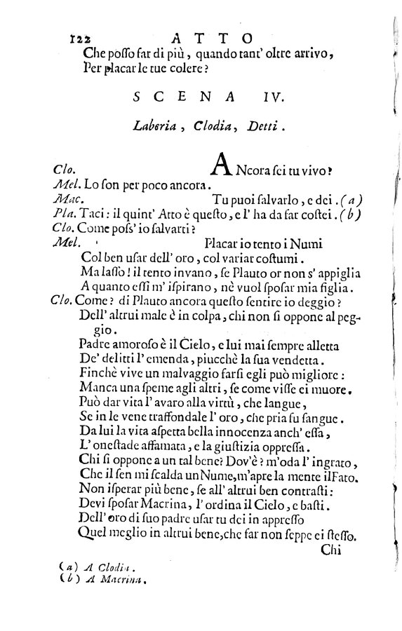 Contiene con intit. a c. A5r: Dissertazione storica, e critica sopra il teatro antico, e moderno - Contiene: Marco Accio Plauto, La pastorella fedele, La buona madrigna, La vendetta amorosa - Segn.: A-Y/8 Z/12 - A c. AYv ritr. dell'A. sottoscritto: Maffeius Foresti del. W. Sc.