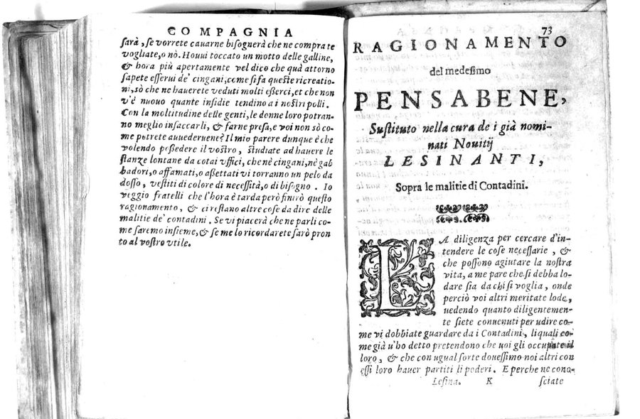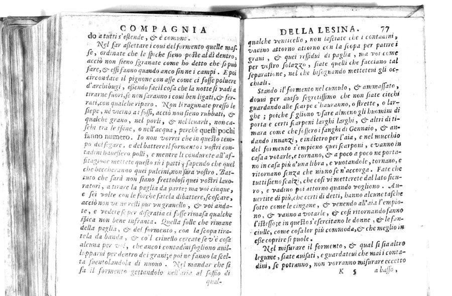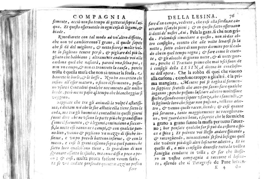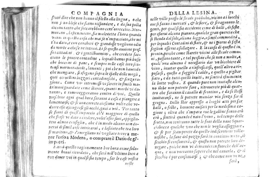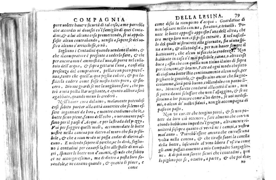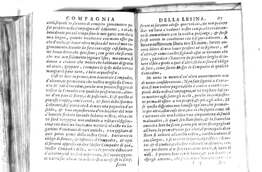 - Della famosissima compagnia della Lesina dialogo, capitoli, ragionamenti, con l'assotigliamento in tredici punture della punta d'essa Lesina. Alla quale s'e rifatto il manico in trenta modi, & doppo quelli in venti altri ... Con la nuoua aggiunta del modo di ricevere li nouitij delle pene debite a' cattiui lesinanti, di tre consulti delle matrone per entrare in questa compagnia. E de gli auuertimenti sopra le malitie de' contadini. Post'insieme dall'Academico Speculatiuo, e raccolti dallo Economo della spilorceria. ...