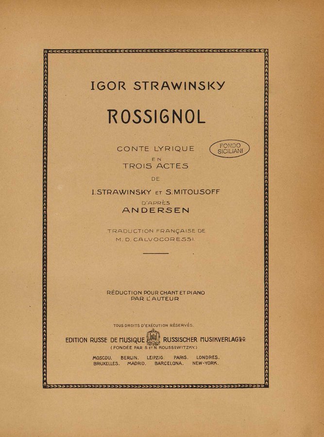 - Le rossignol : conte lyrique en trois actes de I. Strawinsky et S. Mitousoff, d'après Andersen / Igor Strawinsky ; traduction francais de M. D. Calvocoressi ; réduction pour chant et piano par l'auteur