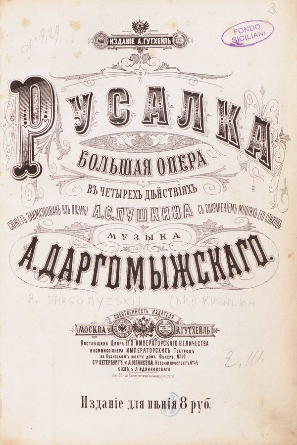 Rusalka : bolʹšaja opera vʹ četyrehʹ dejstvijahʹ / sjužetʹ zaimstvovanʹ izʹ poemy A. S. Puškina sʹ sohraneniemʹ mnogihʹ ego stihovʹ ; muzyka A. Dargomyžskago