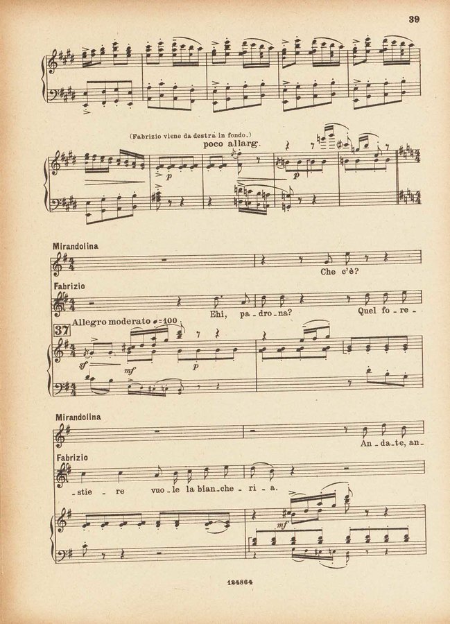 Dettaglio spartito : ˜La œlocandiera : commedia lirica in tre atti e cinque quadri / di Mario Ghisalberti ; (dalla Commedia omonima di ...