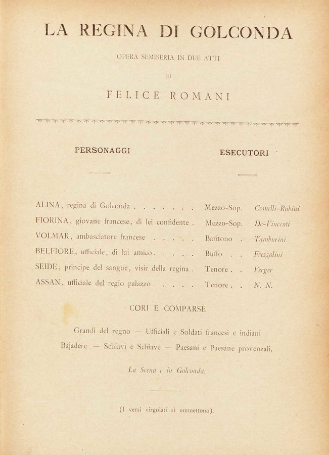 - La regina di Golconda : opera semiseria in due atti di Felice Romani / [musica di! G. Donizetti
