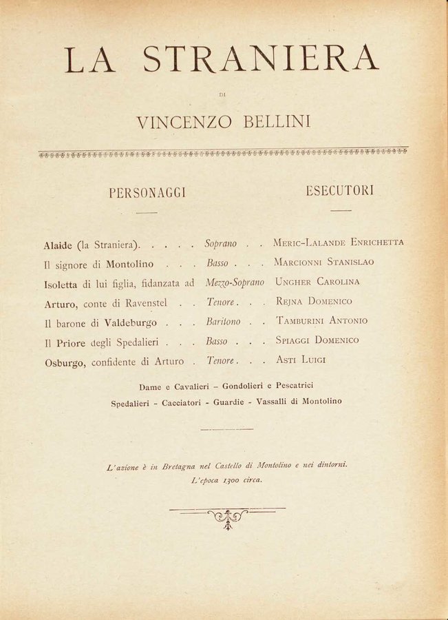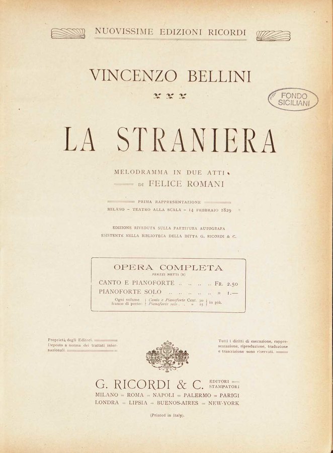 : La straniera : melodramma in due atti / di Felice Romani ; [musica di] Vincenzo Bellini