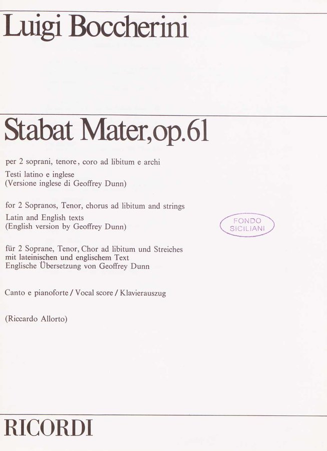 Stabat mater, op. 61 : per 2 soprani, tenore, coro ad libitum e archi : testi latino e inglese / versione inglese di Geoffrey Dunn ... ; canto e pianoforte ... Riccardo Allorto