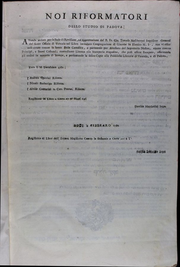 - Venice (Italy), Ashkenazi Finzi, Meshullam, 1784